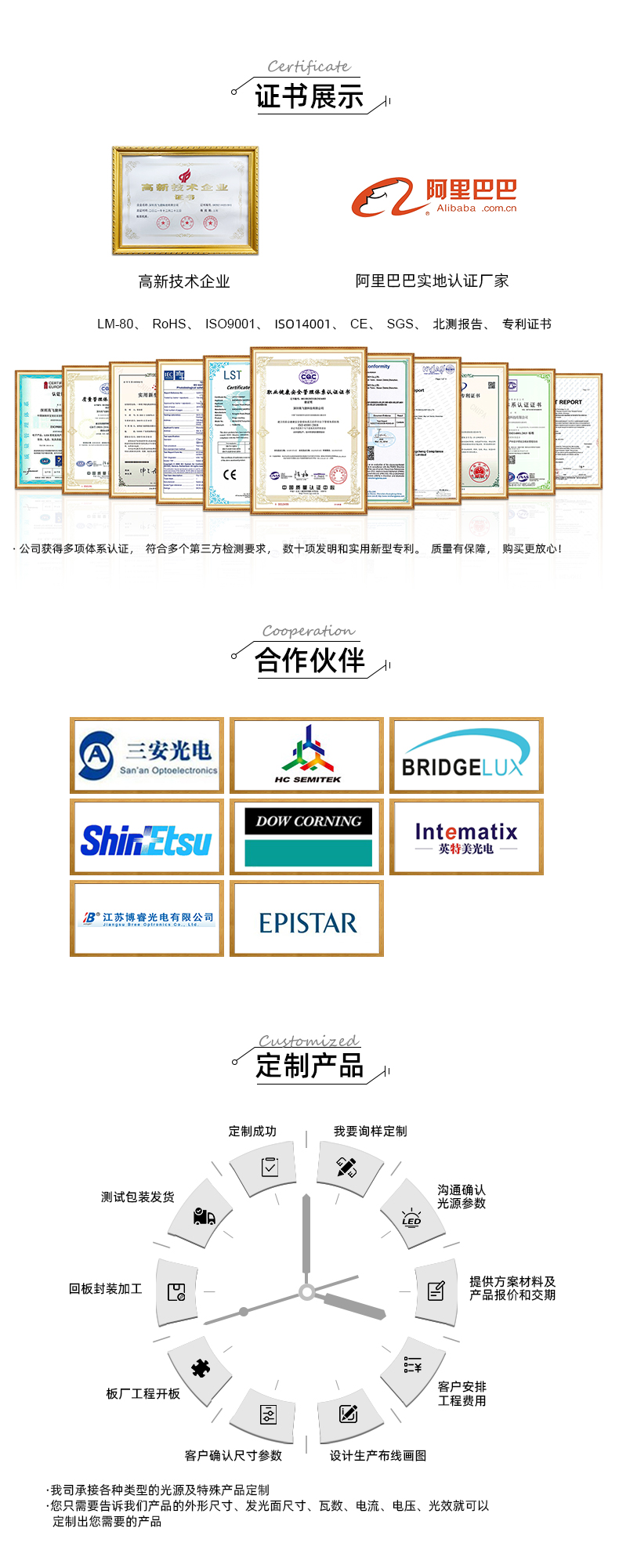7.無金線封裝 降低損耗電阻 可以使用芯片承受更大的驅動電流 方便客戶應用電源匹配的靈活性; 光源產出時間縮短50%以上