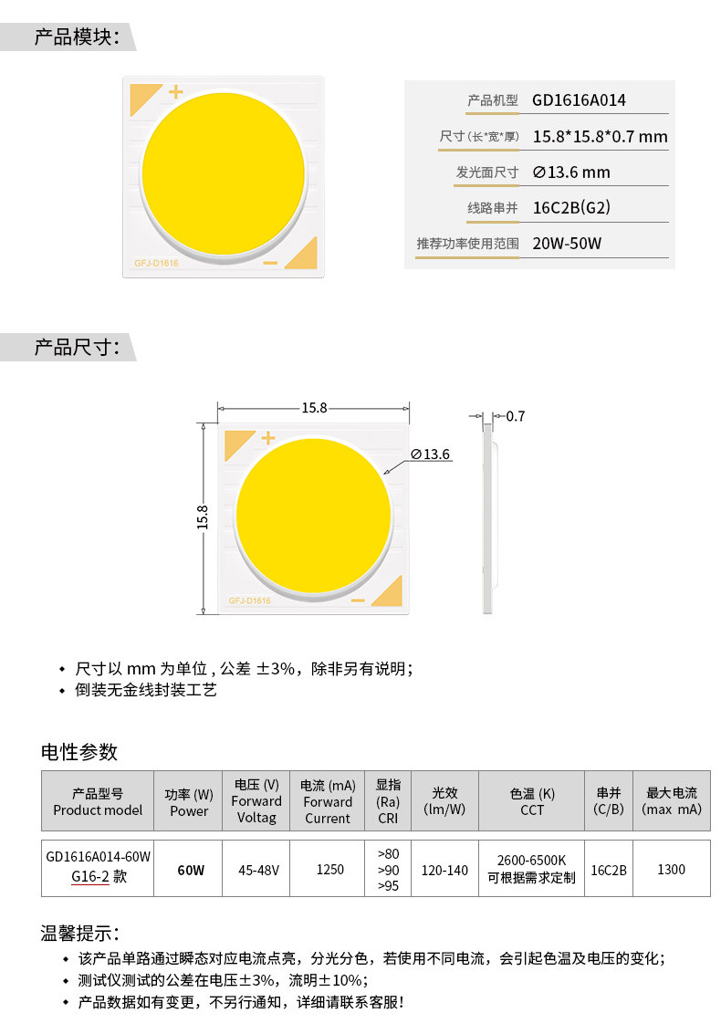 熱門標簽: 室內照明COB光源 LED燈珠 16*16mm 60W高功率 高光效 發光面積小 光密度高